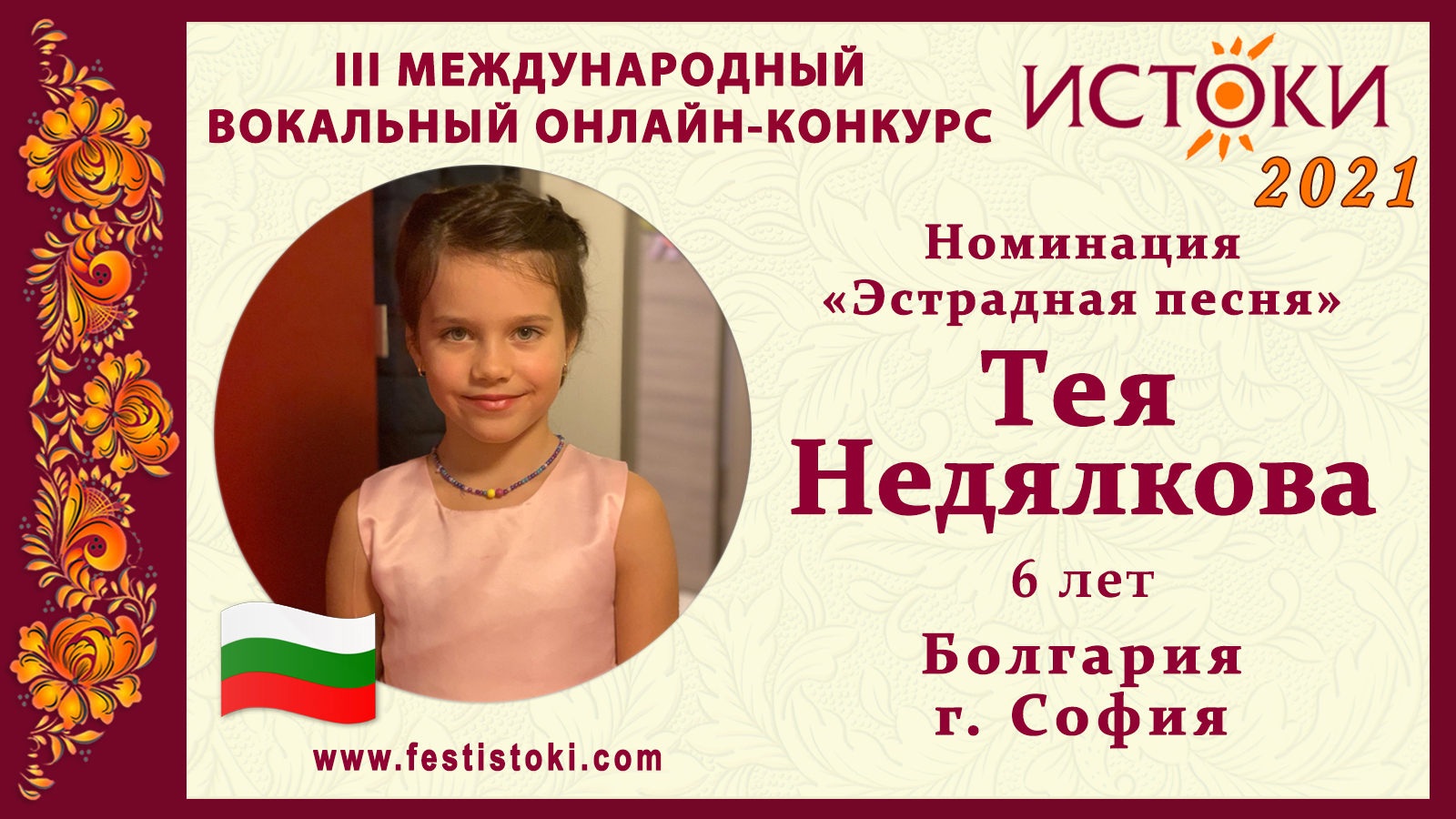 Лауреат III степени III Международного вокального онлайн-конкурса «Истоки». Номинация "Эстрадная песня". Песня "Дано, дано". Текст Марьяны Башевой, музыка Стефана Димитрова. Сайт: www.festistoki.ru / www.festistoki.com E-mail: festistoki@mail.ru