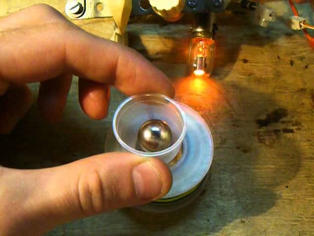 Раскрутка до огромной скорости неодимового магнита в виде шара при помощи устройства Бедини. Схема та же самая, что и всегда: http://siliks.org/STUFF/freeenergy/cooler_bedini_work.gif Напряжение питания - 12 вольт. Используется кулер, переделанный под устройство Бедини, но вместо обмоток кулера подключена двойная катушка. Обмотки намотаны проводом от кроссировки (такой же, как компьютерная "витая пара", но потоньше) на плоской катушке от припоя, в два провода, до заполнения катушки. Переменные резисторы в крайнем правом по схеме положении - т.е. установлены на минимальное сопротивление. Скорость вращения шарика не измерял, но судя по воющему звуку - очень и очень высокая. Неодимовый магнит в виде шара брал здесь: http://magnet-prof.ru/index.php/Drugie-formyi-NdFeB/Magnitnyiy-sharik-D15mm/flypage.tpl.html