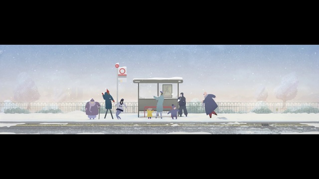 Милый мультфильм о том, как из-за игры в снежки люди опоздали на автобус.