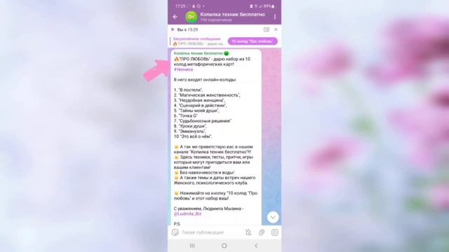 Вот ссылка - https://t.me/klyb_klyb/123 Это ссылка на 10 онлайн-колод карт "ПРО ЛЮБОВЬ", они находятся в телеграм-канале "Копилка техник бесплатно" в ЗАКРЕПЛЁННОМ СООБЩЕНИИ! Вопросы можно задать - Людмиле Мызиной по ватсапп +79224118718 или по телеграм - https://t.me/Ludmila_Biz