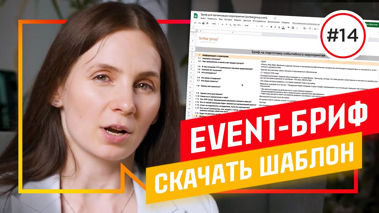 Бриф на мероприятие – документ для разработки и расчета стоимости проведения корпоратива или тимбилдинга. Подпишись – http://bit.ly/event_sub В этом видео я расскажу про бриф на организацию корпоративного мероприятия: что это, зачем он нужен, из каких разделов состоит и какие вопросы нужно задать, чтобы точно понять ожидания и подготовить мероприятие на 5+. А еще заполню для примера бриф на корпоратив Apple, только польза и немного юмора. В первой части видео я расскажу об общих понятиях: – что такое event бриф – какая структура и вопросы – зачем заполнять и с кем согласовывать Во второй части я покажу реальный пример брифа на организацию корпоратива на примере Apple. Включу демонстрацию экрана и будут комментировать каждый вопрос. В конце видео приведу ссылку на скачивание шаблона брифа на организацию корпоративного мероприятия. Важно! Именно корпоративного ивента, такие как тимбилдинг или корпоратив. Если вы планируете организовывать другие деловые события. Скачать пример брифа на организацию корпоративного мероприятия ?????????????? https://eventtalk.ru/event-brif Вместо титров: идейный вдохновитель – Сергей Сичкар, автор стишка-порошка – Яна Белоусова, дизайн открытки – Вадим Гаркуша, артдир – Аня Шейна, камера – Филипп Березин, монтаж – Алексей Носырев. ***** Эти видео смотрят только гении: ?Как выбрать ПЛОЩАДКУ для мероприятия https://youtu.be/pPLSXzMDzSI ? Организация мероприятий: 13 шагов к ИДЕАЛЬНОМУ ивенту [инструкция] https://youtu.be/XMmQAUml01k ?26 способов повлиять на сотрудников через корпоративные мероприятия https://youtu.be/suflFeREs84 ***** Я – Катя Сичкар, организую мероприятия с 2003 года, руковожу креативным агентством Sichkar group, жюрю на международном фестивале рекламы New York Festivals и в национальной премии Событие года.