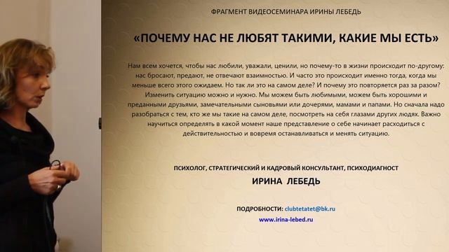 ➤ Ирина Лебедь - психолог, стратегический консультант. Опыт работы в области практической психологии – более 25 лет. ➤ Официальный сайт психолога Ирины Лебедь - http://www.irina-lebed.ru/ ➤ Видеосеминары Ирины Лебедь - http://www.irina-lebed.ru/obuchenie/ ✆ Как ещё можно с нами связаться: ✦Skype: irina.tetatet ✦Email: clubtetatet@bk.ru ✦WhatsApp: +7 (916) 812-21-73 ✦Telegram: https://t.me/masterskaya_probuzhdenie ✦Facebook: https://www.facebook.com/club.tetatet ✦ВК: https://vk.com/club38480683 ✦Twitter: https://twitter.com/Clubtetatet ✦ЖЖ: https://lirina.livejournal.com/ ✦YouTube канал: https://www.youtube.com/user/clubtetatet/featured ✒ По вопросам приобретения занятий и видеосеминаров Ирины Лебедь оставляйте заявки на почту: clubtetatet@bk.ru ➤ Проект ПРОБУЖДЕНИЕ рассчитан на год. За этот период: мы обретаем способность управлять собственной жизнью; - учимся распознавать, классифицировать людей по их природе, действиям, словам; - выстраиваем честные и понятные отношения; - ставим правильно цели и достигаем их в кратчайшие сроки; - уходим от программной судьбы, понимаем, что происходит вокруг и знаем, что со всем этим делать. ➤ За подробностями и условиями участия в проекте обращайтесь на почту clubtetatet@bk.ru. ✒ Запись на презентационную Skype-встречу о проекте также производится по почте clubtetatet@bk.ru или WhatsApp: +7 (916) 812-21-73 ➤ Презентация проекта "Пробуждение" и краткое содержание: https://youtu.be/Tu88Jxr_-dw ➤ Презентация обучения в мини-группе на проекте: https://youtu.be/F6GDigC9uUY ➤ Описание и содержание занятий: https://irina-lebed.ru/proekt-probuzhdenie/ ➤ ПЛЕЙЛИСТЫ по группам видео: 0. Презентации программ, семинаров и проектов: https://youtube.com/playlist?list=PLEISaR6AjsIg-Wo5iOnoPqq_KC17GF2VS 1. Секреты счастливых отношений:https://youtube.com/playlist?list=PLEISaR6AjsIhRJmAtlCPS_bEVzaYQN4L1 2. Муж и жена. Семья и отношения в ней: https://youtube.com/playlist?list=PLEISaR6AjsIifKYoxBt6hIDG2H0E83Dxu 3. Отношения с матерью: https://youtube.com/playlist?list=PLEISaR6AjsIivB5UcLfVyCFk594Z9cIC5 4. Отношения с отцом: https://youtube.com/playlist?list=PLEISaR6AjsIjktuBOZ9X8oTwQDQwQhpMJ 5. Страхи. Как перестать бояться?: https://youtube.com/playlist?list=PLEISaR6AjsIhRJmAtlCPS_bEVzaYQN4L1 6.Уверенность и самооценка: https://youtube.com/playlist?list=PLEISaR6AjsIiOLUwtqkDER6V6VJ1w5IRL 7. Мышления и убеждения. Как изменить: https://youtube.com/playlist?list=PLEISaR6AjsIjEjFD4qP__xLnvHdri77z2 8. Деньги и достаток: https://youtube.com/playlist?list=PLEISaR6AjsIheomC7eHNSiSGvzxEBiqrC 9. Как достичь желаемого: https://youtube.com/playlist?list=PLEISaR6AjsIinCh0w4NNspoPvNAok6mHx 10. Фрагменты проекта "Пробуждение": https://youtube.com/playlist?list=PLEISaR6AjsIgbe-vfZUVE8nHzwEyJGa8r 11. Презентации занятий проекта "Пробуждение": https://youtube.com/playlist?list=PLEISaR6AjsIipxPpRrCDmZwzX42MHESjB 12. Публичные консультации: https://youtube.com/playlist?list=PLEISaR6AjsIgktWzUVWeal5hcLS989dFe А также: "Как изменить привычки", "Прошлое, настоящее и будущее", "Как обрести силу", "Как достичь цели", "Психология стройности", "Женственность и женская природа", "Управление эмоциями, личные границы", "Как принять и поверить в себя", "Стримы", "Ответы на вопросы","Отношения со свекровью", "Семинары" и другие. Позвольте себе жить! #проектпробуждение #пробуждение #баланс #психологириналебедь #психолог