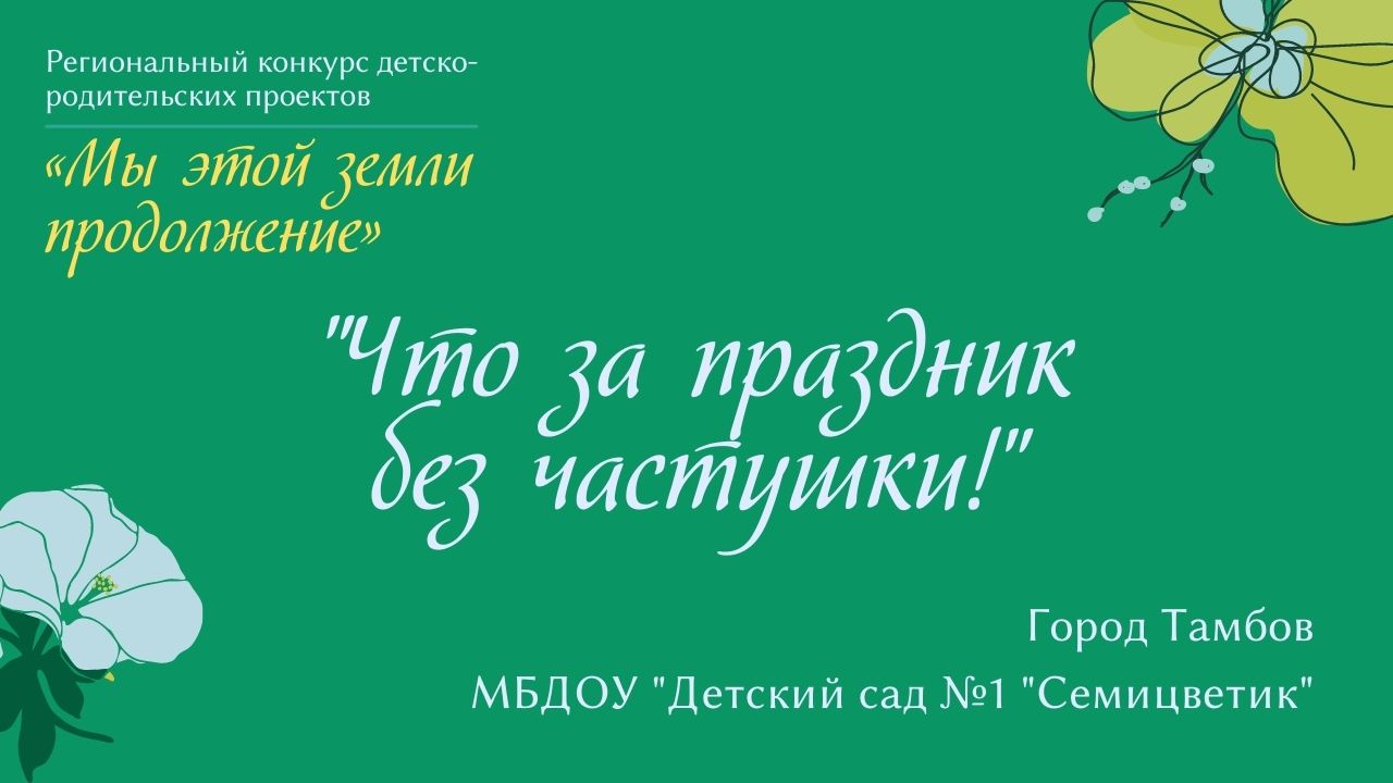 МБДОУ "Детский сад №1 "Семицветик" (г. Тамбов) Родители: Миронова Анастасия Сергеевна, Ситникова Анна Сергеевна, Якунина Кристина Александровна Дети: Рублев Егор, Казарина Полина, Якунина Мирослава, Барабанова Дарья, Мещерякова Алиса, Ситникова Елена, Васильченко Мирослава, Меркухова Ариана, Третьяков Григорий, Трафимов Иван, Миронова София, Величкин Илья, Рылеева Александра, Бибарова-Государева Варвара, Зверев Александр, Дубровин Глеб, Аксенова Инна Руководители проекта (воспитатели): Редина Наталия Юрьевна, Белова Татьяна Михайловна