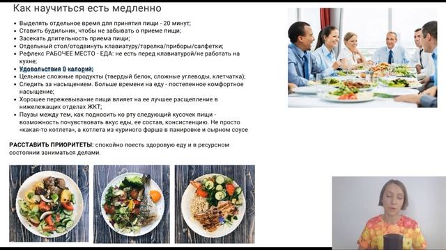 Привет, ребята!;) Сегодня начинаю новый цикл видео на моем канале «32 навыка здорового питания для твоей шикарной фигуры». Каждое видео - это теория + практическое дз. Первое видео - о режиме питания. Большинство людей обедают и ужинают на рабочем месте, второпях, за компьютером, не отвлекаясь от рабочих дел. Важно инвестировать 20 минут в полноценный медленный прием пищи и в свое здоровье. Еда второпях не способствует формированию здорового пищевого поведения. Засеките: сколько времени длится ваш обычный прием пищи: завтрак/обед/ужин?.. Поставьте себе задачу: выделить 20 минут на обед в течение рабочего дня. 20 минут на завтрак и 20 минут на ужин. Это всего 3-4 полноценных приема пищи = 1-1.5 час в день. Очень важно выделять себе спокойное время для приема пищи и хотя бы отодвигать клавиатуру, если невозможно выделить отдельный стол для приема пищи. Но все же старайтесь не принимать пищу там, где вы работаете. Не вырабатывайте у себя пищевой рефлекс «рабочее место = еда». Помните Павлова и его собак?) Пищевой рефлекс может вырабатываться не только на саму пищу и ее запах, но и на звуки, цвета и даже оттенки цвета, предметы, определенное место в помещении. Поэтому важно окружать себя такими положительными «касаниями», которые создадут контекст для внедрения полезной привычки спокойной еды. Важно иметь тарелку и приборы на рабочем месте, создавать благоприятную атмосферу для приема пищи, создавать себе личное пространство, когда вас никто не беспокоит. Ритуал еды - это эстетическое удовольствие от приема пищи. Я его называю «Удовольстие 0 калорий». От того, как все красиво разложено на тарелке, от хороших приборов, сервировки, салфеток, вазы с цветами на столе, запаха еды, от процесса ее приготовления (дома). Даже на рабочем месте используйте стеклянные/фарфоровые и др. тарелки. Не одноразовые и не контейнеры из доставок, а как дома - чтобы все было по-настоящему. Дайте понять своему организму, что по отношению к своему здоровью вы настроены серьезно. Понимание того, что эти 20 минут вы можете выделить для своего здоровья - бесценно! Здесь важно расставить приоритеты. Что для вас важнее: спокойно поесть здоровую еду и в ресурсном состоянии заниматься делами? Или запихивать в себя очередную булку, состав которой вы даже не знаете, засыпая крошками клавиатуру..? Есть медленно помогает наличие цельных продуктов на тарелке. Таких, которые нужно жевать, а перед этим их нужно разрезать. Например, цельный кусок курицы вместо пельменей, сосисок. Крупа альденте вместо картофельного пюре или переваренных макарон/крупы. Наличие свежих хрустящих овощей, а не смузи вместо овощного салата. 20 минут на один прием пищи - это совсем немного. За 20 минут человек лучше насыщается (чем за 3-5 минут быстрого приема пищи), может съест?