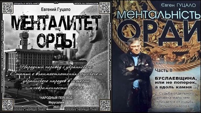 Часть вторая II. БУСЛАЕВЩИНА, или не поперек, а вдоль камня... _____________________________ Нардный перевод с украинского 2023-2024 Читать и слушать всю книгу: https://dl.orangedox.com/MentORD1-12 Плейлист: файлы публикуются по одному в день: https://www.youtube.com/playlist?list=PLbtVK7gJKfkuDpEV_JgUsuaIW86dWrRWp __________________________ "Публицистический цикл Евгения Гуцало составляют статьи, которые печатались на протяжении 1993-95 годов в газете "Литературная Украина". За них автору посмертно присуждена Всеукраинская премия им. Ивана Огиенко. Объединение их в одном цикле вполне оправдано – тематически все они составляют целостность, поскольку посвящены деконструкции культа русского народа, долгое время навязываемого украинцам." "Взаимоотношения украинского и русского народов писатель рассматривает в контексте противопоставления двух типов цивилизаций – оседлой, земледельческой и кочевой, захватнической... Распространившись на огромном пространстве, привыкнув к существованию за счет чужого труда, народ-завоеватель разрушает устоявшийся, органично вписанный в окружающую среду хозяйственный строй порабощенных народов, их обычаи, культуру, идентичность." Лариса Масенко Издатель: Издательский дом "Киево-Могилянская академия", Киев Каталожный номер: ISBN 9665183923 Год издания: 2007 __________________________ Файл «Содержание аудиобиблиотеки издательства "ТВОРЯЩЕЕ СЛОВО"» обновляется по мере новых поступлений. Актуальная версия всегда доступна по ссылке: https://dl.orangedox.com/OoU566mlkxaB8new9e __________________________ Полистать и заказать бумажную версию QR-Каталога аудиобиблиотеки издательства "ТВОРЯЩЕЕ СЛОВО" в подарочном исполнении: https://jerusalem-temple-today.com/KATALOG/