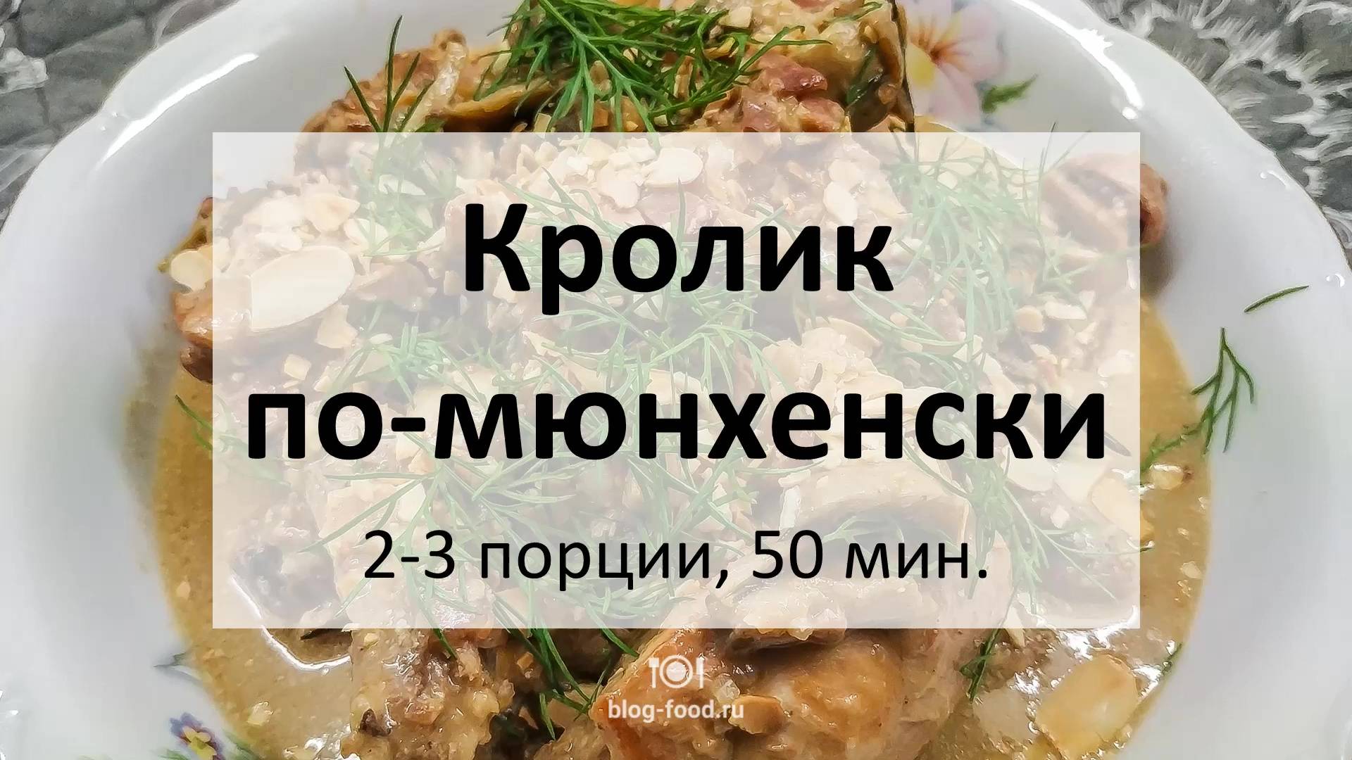 Всем привет. Сегодня сделаем кролика по-мюнхенски, который, по сути, является просто мясом, тушенным в сливочно-грибном соусе. Надёжно, вкусно, ароматно, несложно. Идеальная история как на праздник, так и в трудовые будни. • Кролик, 800 гр. • Сливки 20%, 100 гр. • Шампиньоны, 100 гр. • Лук, 1 шт. • Бекон с/к, 50 гр. • Миндаль (хлопья), 20 гр. • Бульонный грибной кубик, 1 шт. • Чеснок, 3 зубца • Розмарин • Лавровый лист • Чёрный перец, растительное масло, соль Кролика режем небольшими фрагментами, грибы и бекон ломтиками, лук кубиком, чеснок мелко рубим, листочки розмарина отделяем от стеблей. Миндаль обжариваем на сухой сковороде в течение минуты на сильном огне, откладываем в сторону. В сковороду наливаем немного масла, обжариваем кролика по паре минут с каждой стороны, откладываем в сторону. Обжариваем бекон с луком минуту, добавляем чеснок, жарим ещё минуту, периодически помешивая, возвращаем кролика, жарим минуту. Разводим бульонный кубик в 200 мл горячей воды, вливаем в сковороду, добавляем лавровый лист, розмарин, доводим до кипения, солим, перчим по вкусу и тушим под крышкой на минимальном огне полчаса. Удаляем лавровый лист, вливаем сливки, добавляем половину миндальных хлопьев и тушим ещё 10 минут, периодически помешивая. Подаём с зеленью, посыпав оставшимися хлопьями и полив соусом со сковороды. Приятного аппетита! Текстовая версия на сайте: https://blog-food.ru/1174