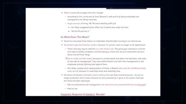 Reset the counter, here's more Blizzard drama. There's been a bit of internal strife, particularly around Geoff Frazier, a 23-year employee of Blizzard. Jessica Gonzalez revealed lots of information about him... Let us know your thoughts on all of this. Supported by our Patrons: http://www.patreon.com/bellularnews Wishlist our game, The Pale Beyond! https://bit.ly/TPB_Steam Twitter: http://www.twitter.com/bellulargaming Join our Discord! https://discord.gg/BNh7bfW Our studio has a site!: https://bellular.games 00:00 Intro 00:51 The Story - A “Darker” Side of Blizzard? 09:33 The Analysis - Deciphering Signal Vs Noise 17:52 The Story - Treyarch Moving Forward