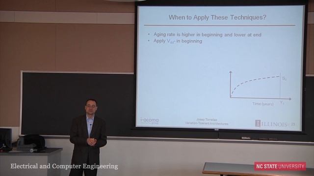 Josep Torrellas spoke on Friday, March 23rd, 2012 at 2:20PM in Engineering Building I, Room 1011 Dealing with parameter variation in a cost-effective manner is one of the main challenges faced by multicore developers. This challenge is best addressed at multiple levels. This talk presents some of the approaches that we have developed at the architecture level. In particular, I show how aging can be traded-off for power and performance, giving rise to a new way to speed-up single thread performance that we call BubbleWrap. I also present work on coping with process variation at near-threshold voltage operation. If time permits, I will discuss some ideas that help us in the road to extreme scale computing. Josep Torrellas is a Professor of Computer Science and (by courtesy) Electrical and Computer Engineering at the University of Illinois at Urbana-Champaign (UIUC). He is a Fellow of IEEE and ACM. He is the Director of the Center for Programmable Extreme-Scale Computing, a center funded by DARPA, DOE, and NSF that focuses on architectures for extreme energy and power efficiency. He also directs the Intel-Illinois Parallelism Center (I2PC), a center created by Intel to advance parallel computing in clients. He has made contributions to parallel computer architecture in the areas of shared-memory multiprocessor organizations, cache hierarchies and coherence protocols, thread-level speculation, and hardware and software reliability. Torrellas is a co-PI of the Intel Runnemede multiprocessor, funded by DARPA under the UHPC program. In the past, he lead the I-acoma multiprocessor project and the DARPA-funded M3T Polymorphic Computer Architecture, co-directed the FlexRAM Intelligent Memory project, and was one of the PIs in the IBM PERCS multiprocessor project, funded under the DARPA HPCS program. He received a Ph.D. from Stanford University.