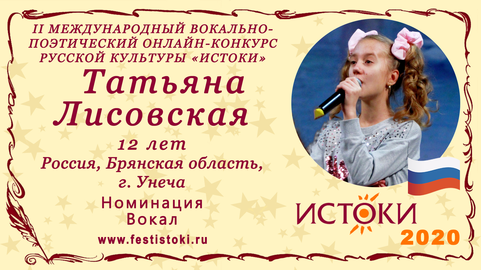 Участник II Международного вокально-поэтического онлайн-конкурса русской культуры «Истоки». Номинация - Вокал. Песня "Нарисовать мечту" Автор Олег Газманов. Сайт: www.festistoki.ru / www.festistoki.com E-mail: festistoki@mail.ru