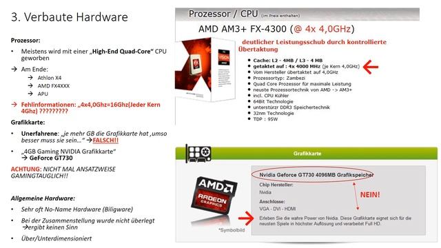 Fertig-PC Verarschung bei Ebay und Co.? In diesem Video schauen wir uns die vermeindlichen "High End Gaming PCs" an , welche als Fertig-PCs bei Ebay und Co. verkauft werden. Halten diese Systeme was sie in der Anzeige versprechen? Leider nicht alle! Viele versprechen in der Anzeige "das ultimative Gamingerlebnis mit High End Hardware", ein genauer blick auf die verbaute Hardware verrät aber das krasse Gegenteil. So halte ich es für vorsichtig Ausgedrückt "unglücklich" eine 4GB NVIDIA GeForce GT730 als Gaminggrafikkarte für Gaming in höchsten Einstellungen anzupreisen, oder ein AMD A6 APU als "High End Quad-Core CPU mit unglaublich leistungsstarker Radeon Grafik" zu bezeichen. Auch der restliche Teil der Hardware dieser Systeme liest sich eher wie ein Aufmarsch sämtlicher minderwertiger Hardware, welche für einem immens hohen Preis zum Kauf angeboten wird. Geschulte Blicke entlarven solche Systeme schnell als "Kundenverarsche". Unerfahrene potentielle Käufer aber lassen sich schnell von solchen Angeboten mit ihrerer schicken Aufmachung mit vielen Bunten Bildern und coolern Schriftarten, sowie heilsbringerischen Versprechungen vom ultimativen Gamingerlebnis schnell einnullen und beeindrucken, ohne zu wissen, dass sie ein schlechtes System erwerben, welches nicht mal ansatzweise als Gaming-PC bezeichnet werden kann. Aber nicht nur die komplett falsche Leistungbeschreibung der Hardware mag verwirren, nein auch komplett falsche Angaben der Spezifikationen lässt den potentiellen Käufer ein vollkommen falsches Bild von der Hardware erzwugen. Ein Klassiker ist der Prozessor. Im Angebot wird ein AMD FX4XXX so beschrieben: "4x4,0Ghz=4Ghz pro Kern!! =16Ghz!!". Für mich persönlich ist das keine Unwissendheit des Verkäufers, sondern eine gezielte Aktion dessen um mit komplett falschen Fakten Profit zu machen. Händler die solcheAnzeigen generieren sind für micht keine Vertrauenspersonen bei welchen ich irgendetwas kaufen würde. Sie machen sich keinerlei Gedanken über ihre angebotenen Systeme und die Hardware welche verbaut ist, sonder verkaufen minderwertige Hardware als "High End Gaming" um ahnungslosen gutwilligen Kunden das Geld aus der Tasche zu ziehen! Natürlich gibt es nicht nur schwarze Schaafe. Genug andere Händler sind vollkommen seriöse Geschäftsmänner, deren "Gaming" Systeme den Namen auch verdienen. Im Unterschied zur Eigenfertigung muss man bei einem Fertig-PC ein wenig mehr Geld in die Hand nehmen, schließlich muss der Händler seine Rechnungen auch bezahlen können. Auch wenn die Eigenfertigung um 100€ oder mehr günstiger ist, hat ein Fertig-PC auch seine Vorteile. Leute keine Lust haben den PC selbst zusammenzustellen und zu konfigurieren, sondern einfach nur anschließen und loslegen wollen. Weitere Vorteile wären das Softwarepaket welches zumeist Windows und andere nützliche Software enthält, welche im Einzelhandel auch extra gekostet hätte. Wie bei vielen anderen Dingen auch gilt hier: Wissen ist Macht! Solange ihr informiert seit, kann euch niemand verarschen oder mit schlechter Hardware über den Tisch ziehen. Und nur weil es einige schwarze Schaafe gibt, heisst es nicht automatisch, dass alle Fertig-PCs Schrott sind. Falls ihr die volle Kontrolle und so günstig wie möglich bleiben wollt, schaut euch Build Guides im Internet an