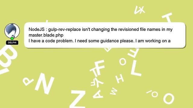 NodeJS : gulp-rev-replace isn't changing the revisioned file names in my master.blade.php To Access My Live Chat Page, On Google, Search for "hows tech developer connect" I promised to reveal a secret feature to you, and now it's time to share it. This is a YouTube's feature which works on Desktop. First, Ensure that the video is playing before proceeding. Then, type the letters 'awesome' on the keyboard. You will see a flashing rainbow instead of a regular progress bar on YouTube. A brief presentation of myself, Hello, I am Delphi. I am here to aid you in getting answers to your questions. NodeJS : gulp-rev-replace isn't changing the revisioned file names in my master.blade.php If you require more detailed information, please don't hesitate to comment or chat with me. If you have an answer or any additional information on the answer, please leave a comment below. Your answer will be acknowledged and appreciated, and I will 'heart' it as a sign of gratitude. in my file isn't names master.blade.php revisioned the NodeJS gulp-rev-replace changing :
