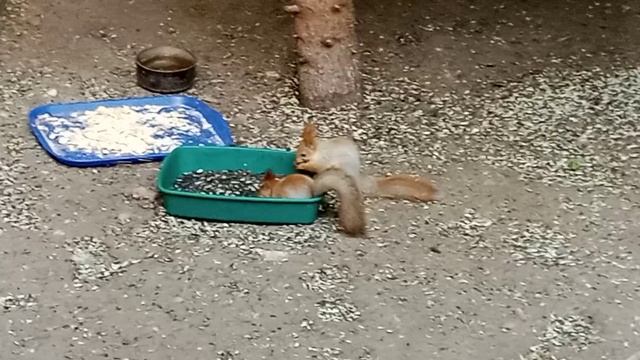 бельчата осваивают кормушки