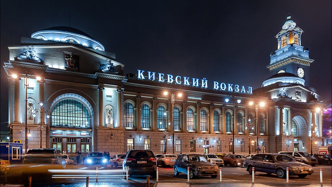Панорамный обзор фасада здания Киевского вокзала в Москве с вечерней подсветкой. Будничная суета после окончания рабочей недели. #киевскийвокзал #москва