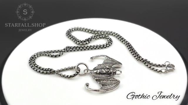 Готический кулон на цепочке в виде летучей мыши "Ночная охотница" от StarfallShop доступен для заказа на Ozon по арт. 1419236127. Подвеска на шею выполнена в стиле унисекс, изготовлена из гипоаллергенной ювелирной стали 316l, не подвержена окислению и коррозии, не боится контакта с водой и духами, не вызывает аллергических реакций.