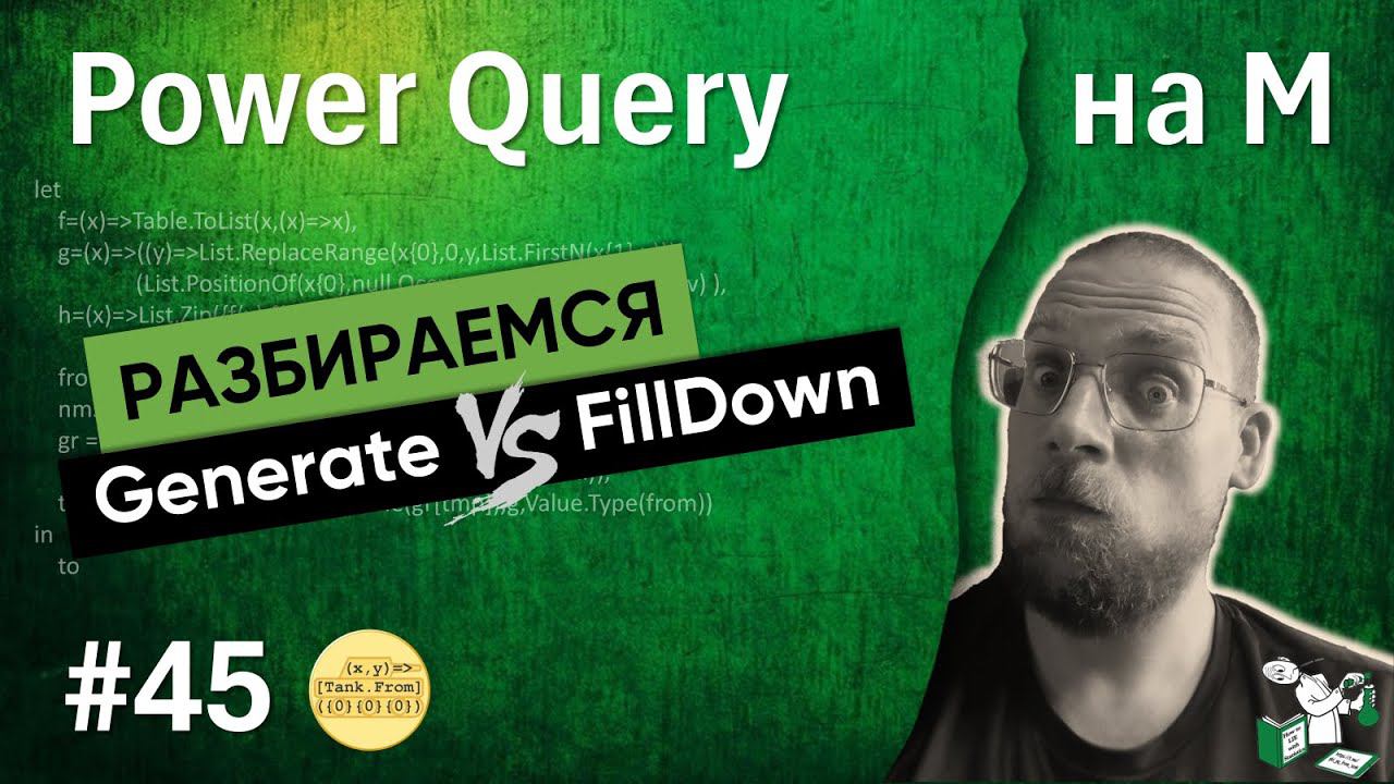 Разбираем интересную задачу из чата — когда «нужен FillDown, но не до конца», т. е. протяжка вниз с дополнительными условиями. Соответственно предложено решение через List.Generate, оптимизированное под большой объем решение через List.Generate, но вишенкой на торте — решение через FillDown, причём не просто решение, а самое эффективное))) Желающие поддержать мою деятельность: мой канал с учебными видео - https://sponsr.ru/pq_m_buchlotnik/ Ну и мало ли интересно: телега тут - https://t.me/pbi_pq_from_tank чат телеги тут - https://t.me/pbi_pq_from_tank_chat #buchlotnik, #Музыкин, #Power Query, #PowerQuery, #M language, #Mlanguage, #язык М, #Excel
