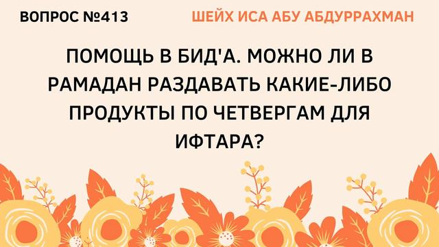 [ Аудиофайл : Шейх Иса Абу абд ар-Рахман – Помощь в бид'а. Можно ли в Рамадан раздавать какие-либо продукты… ] Помощь в бид'а. Можно ли в Рамадан раздавать какие-либо продукты по четвергам для ифтара ❓ ВОПРОС №413: Ассаляму алейкум, шейх. У меня следующая ситуация: Как уже говорилось выше, по четвергам в Рамадан раздают пакеты (конфеты и т.д.). Сегодня четверг и родители хотят купить продукты, чтобы разносить, т.к они далеки от религии и не понимают, что от этого пользы не будет. В связи с этим у меня вопрос: Если я поеду с ними в магазин, но сам не буду покупать эти продукты, а просто положу в машину, будет ли это грехом? __ Можно ли сделать следующим образом: Чтобы это не было новшеством разносить продукты в другой день, чтобы под конец дня соседи разговились этими продуктами? __ И если сойтись на том, что разносим только для того чтобы накормить людей после поста? [Орфография и пунктуация автора сохранены] 🔊 ОТВЕТ МОЖНО ПРОСЛУШАТЬ В АУДИОФАЙЛЕ Уа 'алейкум ас-Салям рахматуЛлахи уа баракятух 🎙Шейх Иса Абу абд ар-Рахман (Да хранит его Аллах во благе). ✅ Ответы на вопросы (https://t.me/answer_sheih_isa) 🌻Остальные ответы на вопросы - https://www.youtube.com/channel/UCEiaKC-C__M_XTsr3xZ9U7w/playlists 🌻Скачать с Яндекс Диска - https://disk.yandex.ru/d/mAirovwnDfecBA 🌻Ulumul Hadith - https://www.youtube.com/channel/UCTNa3fmYtje_pMIg5F-aZgA 🌻Группа в телеграм - https://t.me/answer_sheih_isa
