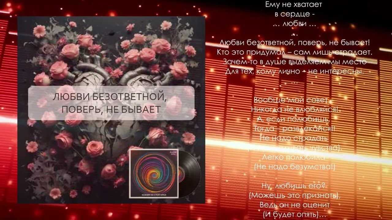 "Любви безответной не бывает"- музыкальный трек с альбома "Нажми на стоп-кран" AnaSM, 2024 ЛЮБВИ БЕЗОТВЕТНОЙ, ПОВЕРЬ, НЕ БЫВАЕТ Опять ты влюбилась. (Или свихнулась). Вновь же на грабли. (Те же наткнулась). Ты улыбнулась. (К нему потянулась). И снова влеченье (Твоё затянулось). По новой придумала (Чувства и мысли). Опять размечталась (Запутавшись в жизни). Девчонки, ну хватит! Сколько же можно!! Любить безответно? Жить потом сложно! Не может ответить на чувства твои. Ему не хватает в сердце - … любви … … Любви безответной, поверь, не бывает! Кто это придумал – сам лишь страдает. Зачем-то в душе выделяем мы место Для тех, кому лично – не интересны. … #музыка #музыкадлядуши #песнисосмыслом #песня #альбом #новинки2024 #песни #песнисосмыслом #музыка #пролюбовь #музыкальный трек #AnaSM #music #пишупесни
