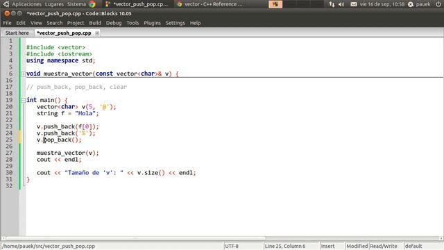 Se explican los métodos 'push_back', 'pop_back' y 'clear' de la clase vector.