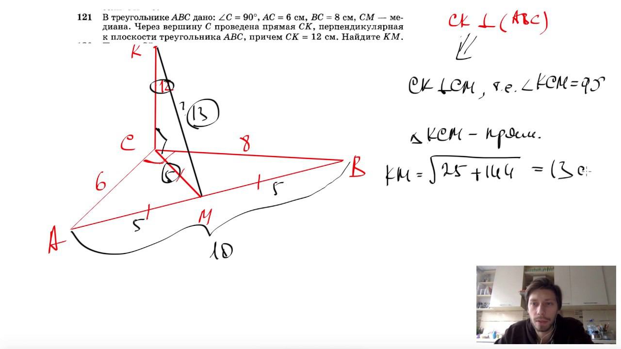 №121. В треугольнике ABC дано: ∠C = 90°, AC = 6 см, ВС = 8 см, СМ — медиана. Через вершину С проведена прямая СК, перпендикулярная к плоскости треугольника ABC, причем СК = 12 см. Найдите КМ. Поддержать канал рублём - 5469400944002125 (Сбербанк) Мой второй канал для подготовки к ЕГЭ и ОГЭ - https://www.youtube.com/ЕвгенийСумин Инстаграм - https://www.instagram.com/EGE_OGE.math Личный инстаграм - https://www.instagram.com/ee_sumin VK - https://vk.com/evgeniysumin FB - https://www.facebook.com/EvgeniySumin