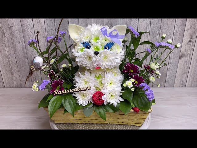 Букет в виде кошечки, собранный в плетеном кашпо. Детальнее о товаре https://ranunculus.ru/igrushki-iz-tsvetov/koshechka-iz-tsvetov/ Смотрите также: Кошки из живых цветов https://ranunculus.ru/igrushki-iz-tsvetov/koshki-iz-tsvetov/ Животные из цветов https://ranunculus.ru/igrushki-iz-tsvetov/zhivotnye-iz-tsvetov/ Наш интернет-магазин https://ranunculus.ru