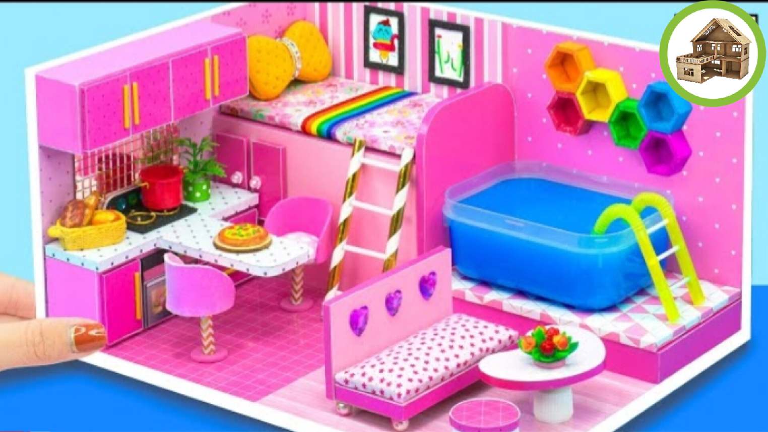 Самый симпатичный розовый миниатюрный домик со всеми удобствами для всей семьи из картона /275