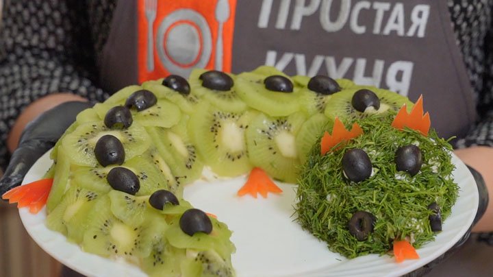 Простая кухня | Салат «Дракон» #дракон #простаякухня #готовимдома #быстропростовкусно #новыйгод #блюда #еда #готовка --------------------------------------------------------------------- Рецепт: Лук репчатый - 100 г ДЛЯ МАРИНАДА: Сахар - 1 ст. л. Соль - 0,5 ч. л. Яблочный уксус 6% - 3 ст.л (или 9% - 2 ст.л) Кипяток - 100 мл Сырки плавленые - 3 шт. Яйца варёные - 3 шт. Картофель отварной - 3 шт. Курица копчёная - 300 г Майонез + сметана - 200 г Соль - по вкусу ДЛЯ УКРАШЕНИЯ: Киви - 4-6 шт. Сладкий красный перец - 1 шт. Маслины чёрные 2-3 шт. Укроп свежий - 20 г Майонез - 1 ст. л.