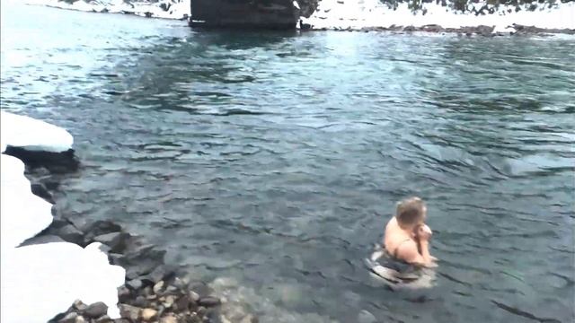 Девушка раздевается и купается в зимней воде.