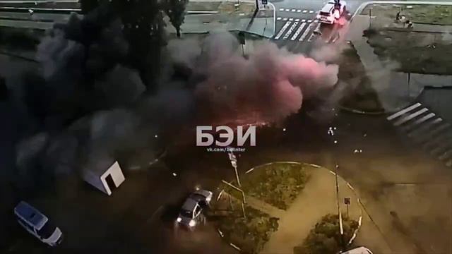 Белгород, прилет реактивного снаряда РСЗО ВСУ рядом с бетонным укрытием. Чудом никто не пострадал