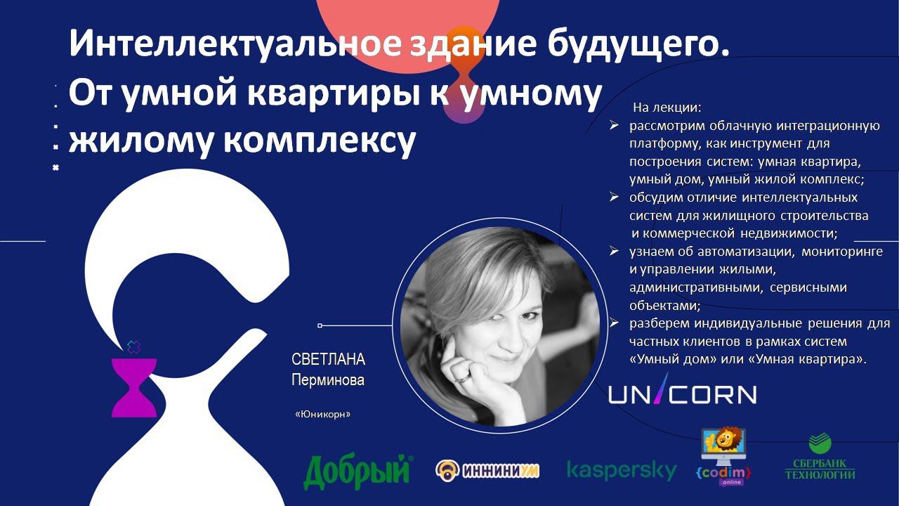 Лекция «Юникорн» «Интеллектуальное здание будущего. От умной квартиры к умному жилому комплексу». На лекции: рассмотрим облачную интеграционную платформу, как инструмент для построения систем: умная квартира, умный дом, умный жилой комплекс; обсудим отличие интеллектуальных систем для жилищного строительства и коммерческой недвижимости; узнаем об автоматизации, мониторинге и управлении жилыми, административными, сервисными объектами; разберем индивидуальные решения для частных клиентов в рамках систем «Умный дом» или «Умная квартира». Спикер: Светлана Перминова Главный исполнительный директор Unicorn. В 2001 году окончила Физико-математическое отделение Лицея №1 при ПГТУ с серебряной медалью. В 2003 году прошла переквалификацию в РМЦПК при ПГТУ, Факультет Менеджмента и бизнеса, Экономика и менеджмент малого и среднего бизнеса, красный диплом. С 2007 года прошла тренинги по продажам, командообразованию, лидерским качествам. Подробнее познакомиться с компанией можно на сайте: https://ujin.tech.
