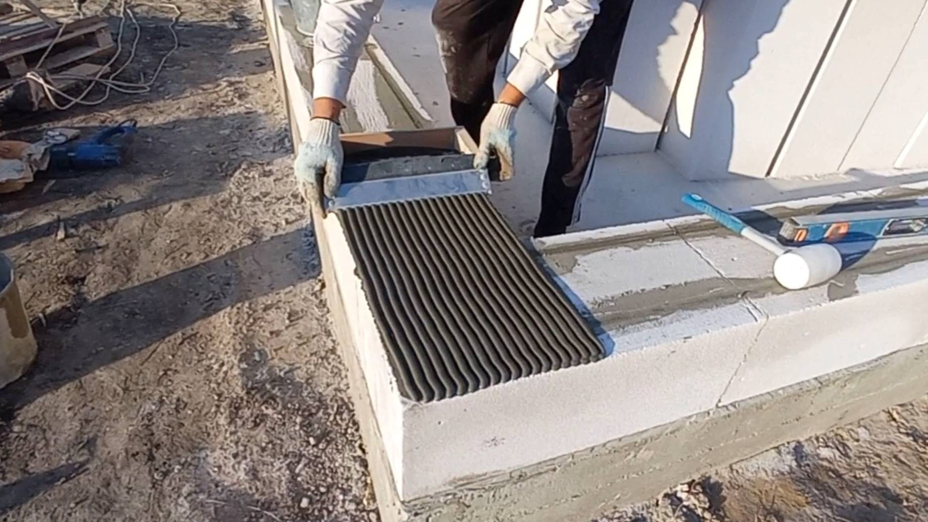 Ролик о кладке первого ряда газобетонных блоков с армировкой