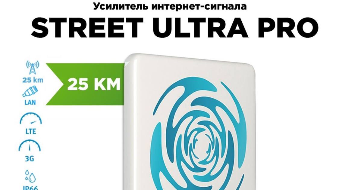 Усилитель интернет-сигнала Street Ultra Pro — обновлённая версия 2026 года, которая обеспечивает стабильное 4G/LTE-соединение на расстоянии до 25 км от сотовых вышек. Некоторые характеристики устройства: оснащён процессором 880 МГц и двумя ядрами, а также памятью ОЗУ 128 МВ и памятью ПЗУ 32 МВ; поддерживает стандарты связи LTE-1800, UMTS-2100, LTE-800, UMTS-900, LTE-2600, GSM-1900, GSM-1800, LTE-2100, LTE-2300, LTE-900 и LTE-2100; имеет две антенны: наружную и комнатную, обе с направленной направленностью и двойной поляризацией; коэффициент усиления антенны составляет 22 дБ; устройство работает при температуре от минус 30 до плюс 40 градусов, не боится воды и солнечного ультрафиолета; максимальная длина LAN-кабеля для подключения — 120 м; в модели 2024 года установлен новый слот на 2 сим-карты, что позволяет оставаться на связи в случае сбоя в работе одного из операторов.