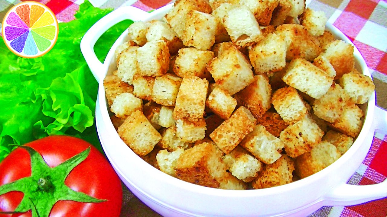 Два очень простых способа приготовления вкусных и очень ароматных чесночных сухариков или крутонов, которые подойдут для приготовления множества вкусных салатов, таких как салат «Цезарь», «Калейдоскоп», «Астра» и т.д. Также крутоны можно подать к различным супам – гороховому, картофельному, луковому и т.д. Продукты и их примерное количество: Не очень свежий белый хлеб или батон 100 грамм (рекомендуется срезать с хлеба корку, но я этого никогда не делаю, получается также вкусно) Оливковое или подсолнечное масло 2 ст. ложки Соль щепотка Чеснок 2 зубчика или гранулированный ½ ч.л. (лучше использовать чеснок в гранулах, он равномернее распределяется) По желанию в сухарики можно добавить различные специи (перцы, паприка, орегано, хмели-сунели, прованские травы, зелень и т.д.)