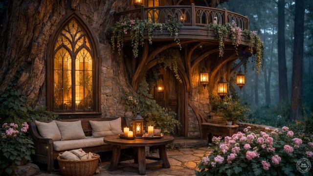 https://vk.com/ardaelenat Представьте, что вы входите в сокрытое жилище, где каменные стены и деревянные конструкции выросли прямо из сердца исполинского древнего дерева. Вы устраиваетесь на мягкой скамье на каменной террасе, окруженные ароматом розовых цветов и влажной земли. Мягкое золотистое свечение арочных окон и янтарных фонарей приглашает вас оставить все заботы мира позади, пока лес начинает погружаться в безмятежные сумерки. Это видео создано, чтобы помочь вам расслабиться, обрести спокойный сон или сосредоточиться на чтении любимой книги. Научные исследования показывают, что погружение в подобные фантазийные миры в сочетании с природными звуками способно значительно улучшить настроение и снизить уровень стресса. Пусть эфирные мелодии арфы и флейты станут вашим проводником, дополненные нежным шелестом листвы и далеким шепотом вечернего леса.