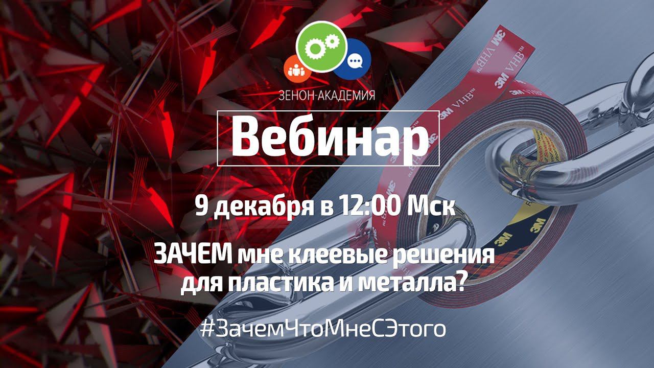 9 декабря в 12:00 по московскому времени ждём вас на первый зимний вебинар! Вебинар будет посвящён решениям для склейки пластика и металла. И проведёт его специалист нашей компании совместно с представителем бренда 3M. Гостем нашей студии будет Георгий Демченко, Ведущий инженер 3М. Какие вопросы будут разбираться в ходе вебинара: Насколько надежно клеевое соединение, его плюсы и минусы Какие материалы легко склеить и какие - сложно? От чего зависит прочность клеевого соединения? Лучшие продукты компании 3М для склейки металлов и их реальные применения Лучшие продукты компании 3М для склейки пластиков и их реальные применения и, конечно, ЧТО Я БУДУ С ЭТОГО ИМЕТЬ? До встречи в прямом эфире!