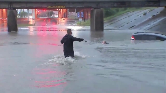 В американском штате Техас в понедельник начались сильные ливни, в результате в низинных районах Хьюстона образовались паводки. Сотни тысяч людей находятся без электроэнергии, и серьёзные ливни, как ожидается, будут продолжаться во вторник. Местный репортёр ABC 13 Стив Кэмпион, освещавший наводнение в Хьюстоне, увидев, что заехавший на затопленный участок дороги автомобиль стал погружаться под воду, начал кричать, чтобы пассажиры выбирались из машины. Когда автомобиль наполовину оказался под водой, из него выбрался мужчина. Кэмпион крикнул, чтобы тот бросил автомобиль и начал плыть к возвышенности. Когда мужчина почти доплыл, Кэмпион с микрофоном в руках зашёл в воду и помог мужчине выбраться. Через некоторое время автомобиль полностью ушёл под воду.