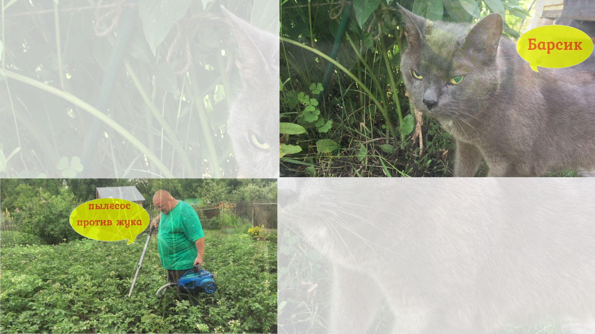 Мы и дачи. Барсик решился выйти из квартиры и погулять на дачном участке. Кот у нас уникальный и чтобы вытащить его из дома, очень сильно пришлось уговаривать. Прогулка ему пошла только на пользу. Продолжаем бороться с колорадским жуком, так как приобретённая химия в магазине не помогла. Решили прибегнуть к помощи пылесоса и это на удивление принесло более результативный ущерб этому прожорливому монстру по уничтожению картофеля. Всем мира и добра.
