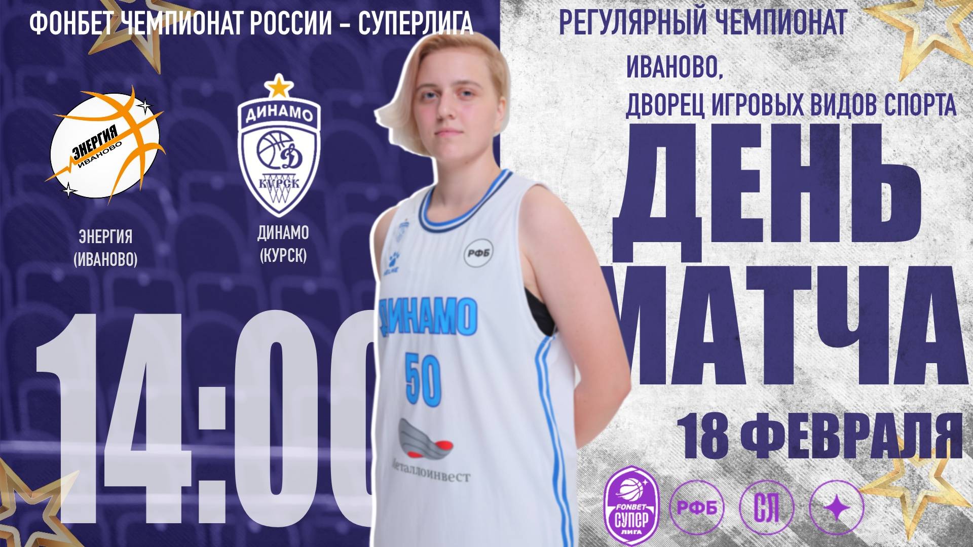 18.02.2024 14:00 Энергия (Иваново) - Динамо-Фарм (Курск) Арена: Иваново, Дворец игровых видов спорта Фонбет Чемпионат России - Суперлига, Регулярный чемпионат Статистика: https://russiabasket.ru/games/775107?apiUrl=https://org.infobasket.su&lang=ru