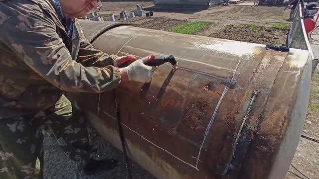 Посмотрим что внутри... Вскрываем поливную бочку плазморезом. Жизнь в деревне