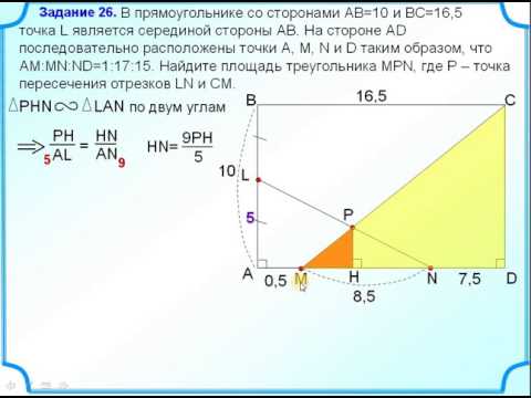 В прямоугольнике со сторонами АВ=10 и ВС=16,5 точка L является серединой стороны АВ. На стороне АD последовательно расположены точки А, М, N и D таким образом, что АМ:MN:ND=1:17:15. Найдите площадь треугольника MPN, где P – точка пересечения отрезков LN и CM.