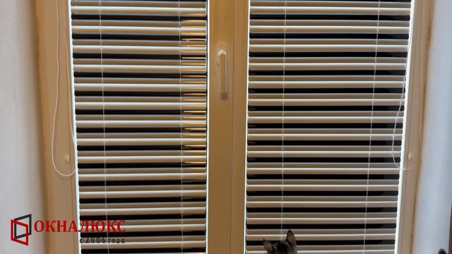 Горизонтальные трехцветные жалюзи на окне под окрас домашнего питомца. Окналюкс Севастополь