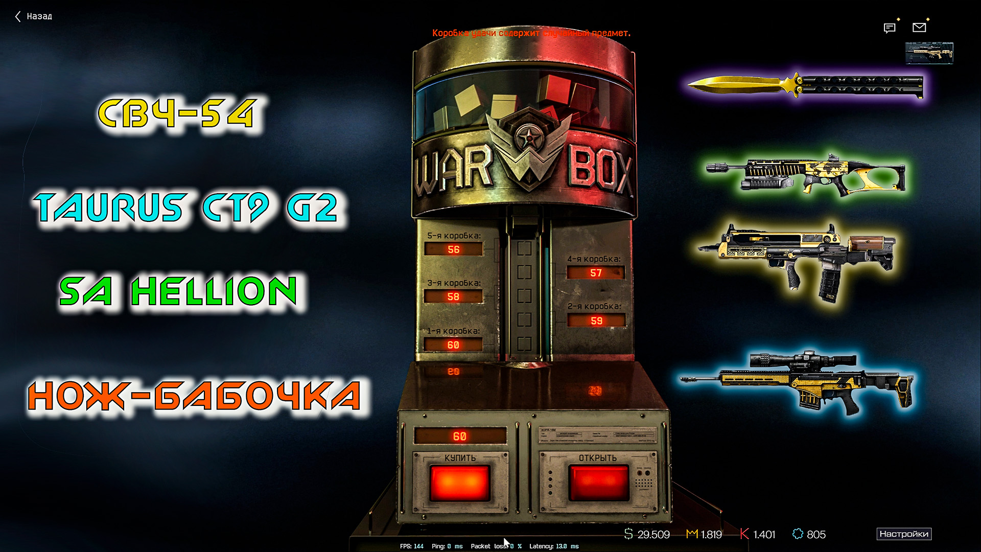 Warface(M.e.L):Выбиваю Taurus CT9 G2; SA Hellion; СВЧ-54 и на сдачу нож-бабочку
