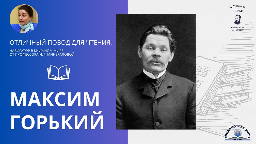 Библиотека МПГУ представляет проект "Отличный повод для чтения: навигатор в книжном мире от профессора И. Г. Минераловой" О жизни и творчестве Максима Горького рассказывает профессор Кафедры русской литературы XX-XXI веков Института филологии МПГУ, доктор филологических наук Минералова Ирина Георгиевна. Создатели проекта: авторы идеи – Минералова И. Г., профессор Кафедры русской литературы XX-XXI веков Института филологии МПГУ, доктор филологических наук, Лиханова И. В., директор библиотеки МПГУ, Свирина М. Н., заведующий информационно-справочной службой библиотеки МПГУ; подготовка материалов –Семенова Е. В., главный библиограф; текст за кадром, монтаж – Климова А. А., главный библиотекарь. Вопросы о доступности изданий из фонда Библиотеки МПГУ Вы можете направить на почту: lib_ms@mpgu.su . Адреса отделов Библиотеки МПГУ Вы можете посмотреть, перейдя по ссылке: http://mpgu.su/ob-mpgu/struktura/biblioteka/struktura/