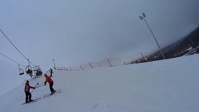 Первый спуск с горки с инструктором. Горнолыжный комплекс "Степаново".