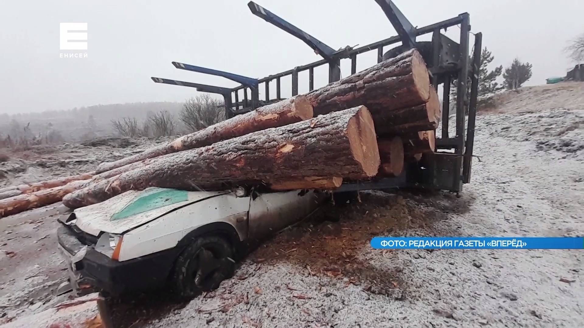 В Уяре легковушку расплющило упавшими с лесовоза бревнами