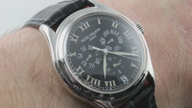 *перевести видео можно в Яндекс браузере Годовой календарь Patek Philippe 5035G-001 представлен в платиновом корпусе диаметром 37 мм с черным циферблатом и новым черным ремешком из кожи аллигатора с платиновой раскладывающейся застежкой. Функции: часы, минуты, малая секундная стрелка, день недели, дата, месяц, 24-часовой индикатор и годовой календарь. Толщина часов составляет 10,8 мм, а расстояние между ушками — 44 мм. Чтобы узнать подробности, посмотрите полный обзор!