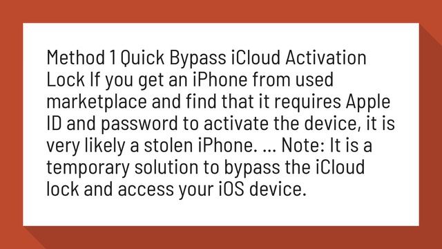Can you bypass Apple ID? How to Bypass iCloud Activation Lock - FonePaw Dec 10, 2018 Method 1 Quick Bypass iCloud Activation Lock If you get an iPhone from used marketplace and find that it requires Apple ID and password to activate the device, it is very likely a stolen iPhone. ... Note: It is a temporary solution to bypass the iCloud lock and access your iOS device.