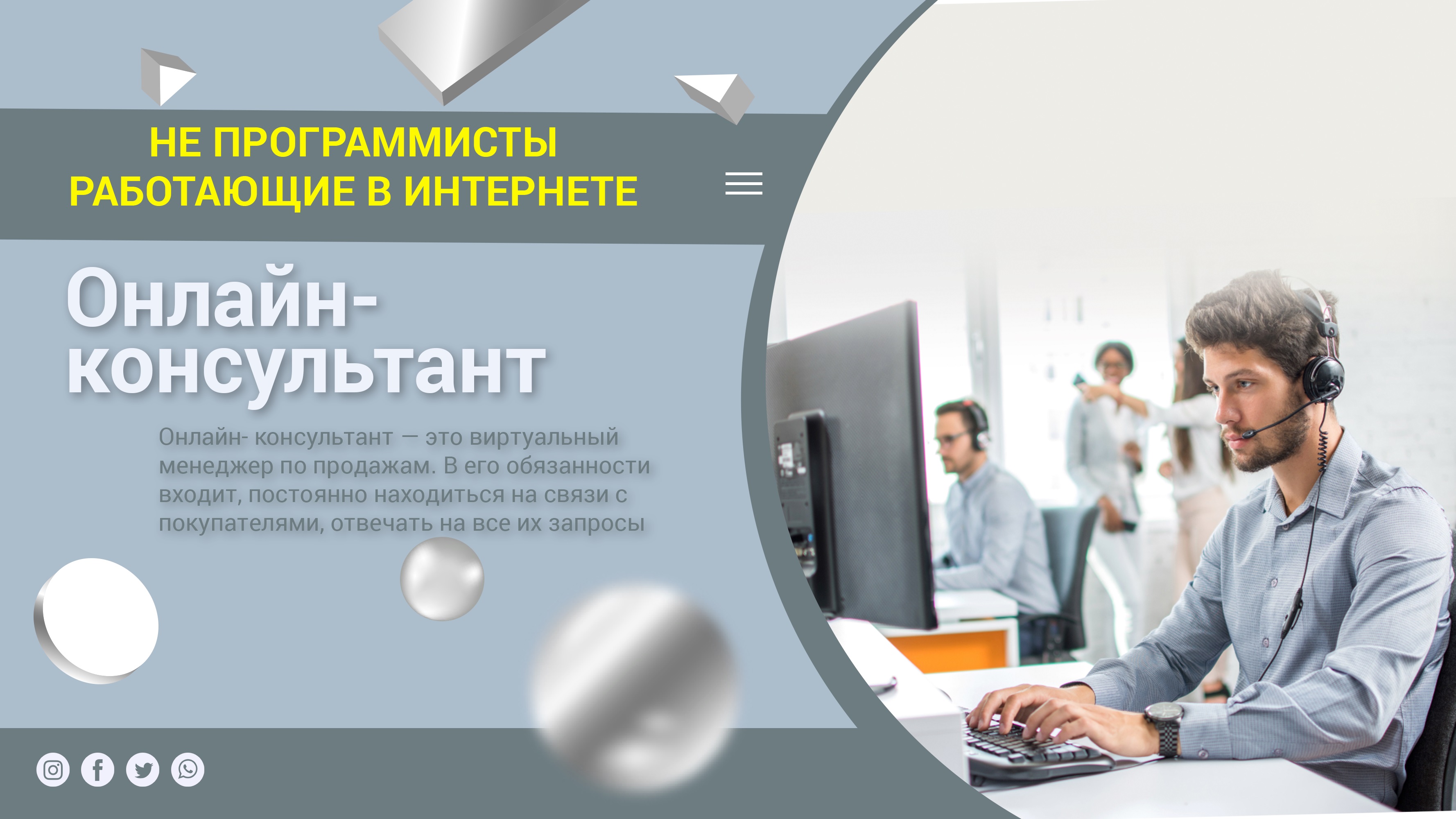 Онлайн-консультант Онлайн- консультант — это виртуальный менеджер по продажам. Больше информации на сайте https://zarabotokvint.ru В его обязанности входит, постоянно находиться на связи с покупателями, отвечать на все их запросы, подводить их к покупке, первым узнавать об отзывах товаров и услуг компании. Консультант и покупатель могут общаться по мобильному телефону, электронным письмам или социальным сетям. Для профессии необходимы знания об основе продаж, грамотность, способность доходчиво излагать свои мысли. Работа не требует специального образования, поэтому начать работать не составит труда. Доход не самый большой, от 20 до 50 тысяч рублей в месяц. Вам может быть интересно Удаленная работа настоящее, будущее, плюсы и минусы https://zarabotokvint.ru/zarabotok/udalennaya-rabota Интернет маркетолог https://zarabotokvint.ru/profi/internet-maketolog