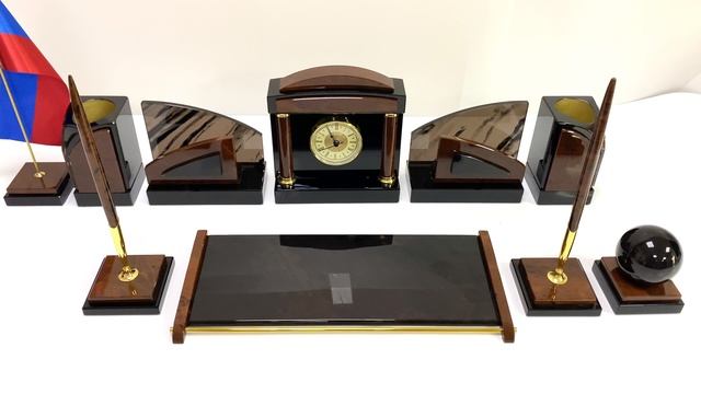 •Материал: обсидиан, механизм капсульный, латунь. •Техника исполнения: камнерезные работы. •Размеры: при плотной компоновке на столе: 750*270*180мм. - Часы 170*70*180 мм -1шт, - Карандашница 75*75*128мм-2шт. - Бумажница 150*73*125-2шт, - Подставка под планинг 350*150*25мм-1шт. - Подставка с тюльпаном 81*81*20мм-2шт. - Подставка под флагшток 73*73*25-1шт. - Подставка под шар 73*73*25-1шт, шар Ø66мм. - Ручка 12*12*195мм-2шт. •Вес брутто 10,6кг. •Упаковка: картон. •Изделие в наличии при заказе вы получите образец, который представлен на фотографии.