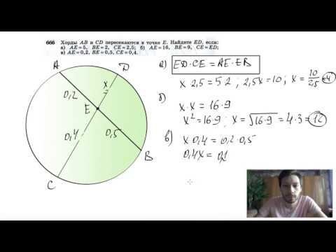 №666. Хорды АВ и CD пересекаются в точке Е. Найдите ED, если: а) АЕ = 5, ВЕ = 2, СЕ = 2,5; б) АЕ = 16, ВЕ= 9, CE=ED; в) АЕ = 0,2, ВЕ = 0,5, CE=0,4. Поддержать канал рублём - 5469400944002125 (Сбербанк) Мой второй канал для подготовки к ЕГЭ и ОГЭ - https://www.youtube.com/ЕвгенийСумин Инстаграм - https://www.instagram.com/EGE_OGE.math Личный инстаграм - https://www.instagram.com/ee_sumin VK - https://vk.com/evgeniysumin FB - https://www.facebook.com/EvgeniySumin