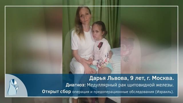 Дарья Львова, 9 лет. Диагноз: Медуллярный рак щитовидной железы, мутация гена РЕТ. Необходимо: Предоперационное обследование и операция в клинике Ихилов (Израиль). Сумма сбора: 2 896 829 рублей. История и документы: https://kseniya.fund/komu-pomoch/dary... Дашеньке 9 лет, и она уже очень хорошо понимает, что с ней происходит. К лету прошлого года у Даши стала проявляться странная припухлость на шее. После УЗИ, КТ и пункции их ждали тревожные новости... Это был медуллярный рак щитовидной железы, очень тяжелый и нетипичный случай для ребенка. Врачи сразу сказали, что ситуация очень тяжелая, во всем мире зарегистрировано только 180 подобных случаев. Мама в тот момент уже ничего не слышала. После таких слов, просто не хотелось жить: ...«У вас очень тяжелая ситуация»... ...«Конечно, КАКОЕ-ТО лечение мы вам назначим»... ...«Только операция, а дальше как будут обстоять дела»… Родители Дашеньки поняли, что нужно спасать ребенка. Они продали машину, собрали все накопления и сбережения, заручились поддержкой друзей и выехали в Израиль. Началось лечение биологическими препаратами, чтобы уменьшить область поражения и в конце апреля провести операцию. Сейчас большая часть сбережений уходит на аренду квартиры и питание в Израиле. Стоимость предстоящей операции очень большая, а сбережения родителей на исходе. ? Помогите родителям спасти Дашу от страшной болезни! ? СБОР ЗАКРЫТ! СПАСИБО ЗА ПОМОЩЬ.